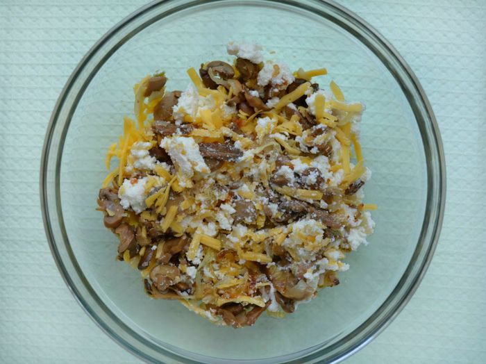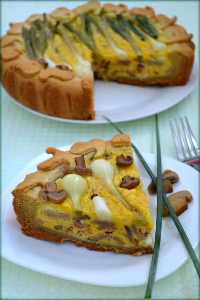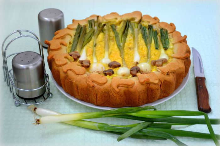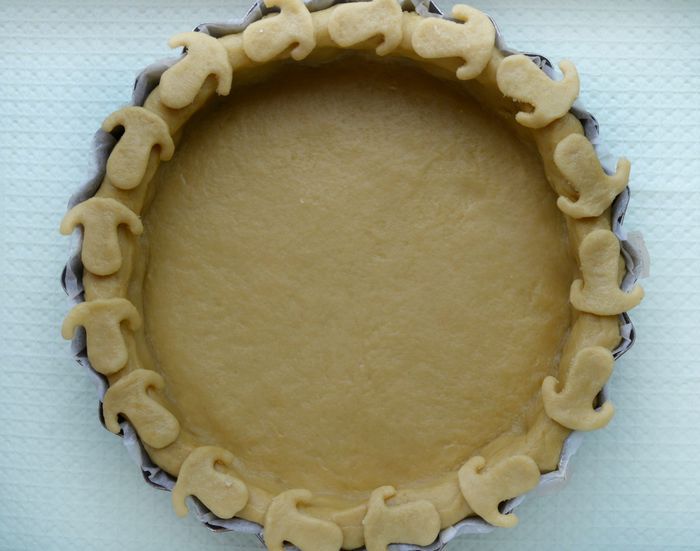 Достать тесто. Форму для выпечки застелить пекарской бумагой, смазать растительным маслом, если бумага без пропитки. Тесто раскатать в круг, диаметром, превосходящим диаметр формы см на 5, чтобы сделать бортики. Перенести круг в форму при помощи скалки. Края обрезать кулинарными ножницами. Края слегка придавить пальцами вовнутрь, чтобы получился красивый, ровный бортик. Оставшееся тесто пойдет на украшение. Выложить начинку и залить 2-мя взбитыми миксером яйцами.