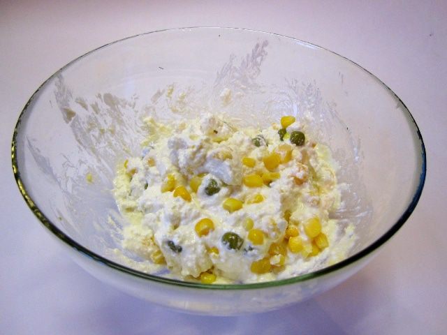 Размешать, посолить, поперчить, добавить горошек и кукурузу без маринада.