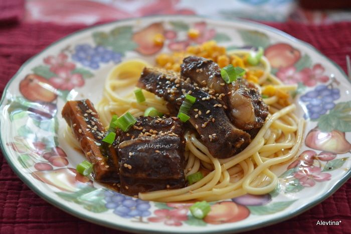 Подаем ребрышки с готовым гарниром. Посыпав кунжутным семенем и зеленым нарезанным луком.