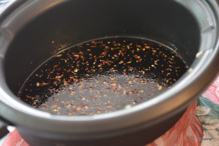 Смешать в емкости для готовки соевый соус, мясной бульон, коричневый сахар, чеснок мелко порубленный, имбирь протертый, кунжутное масло, красный перец хлопьями.