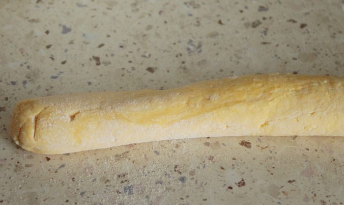 Замесить гладкое однородное тесто, тесто будет немного липнуть к рукам, но при этом хорошо соберется в шар. Из готового теста сформировать колбаски, нарезать каждую на кусочки.