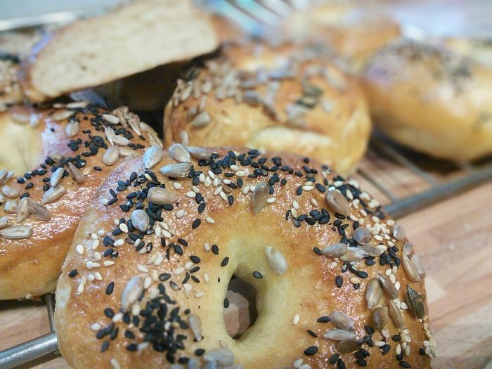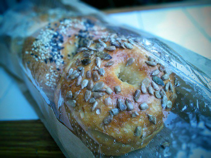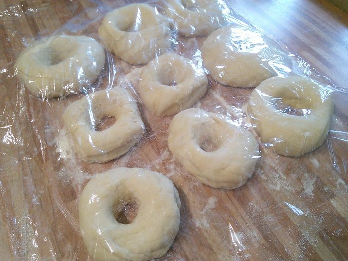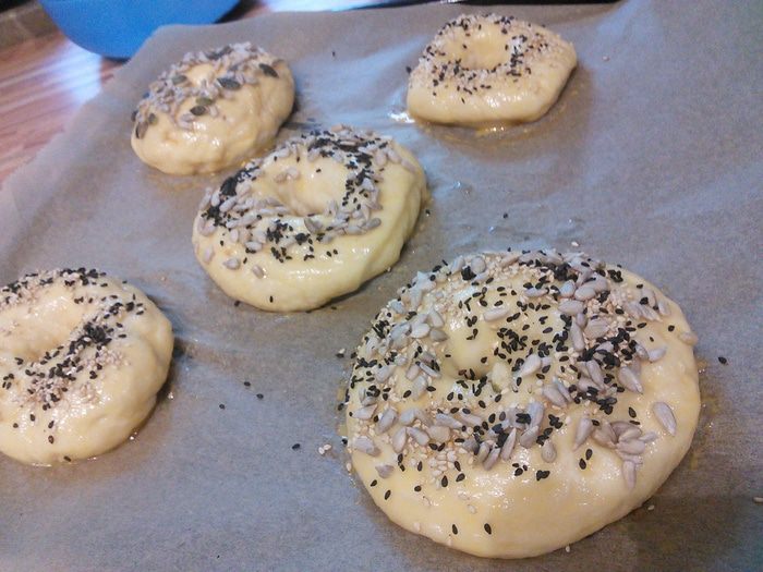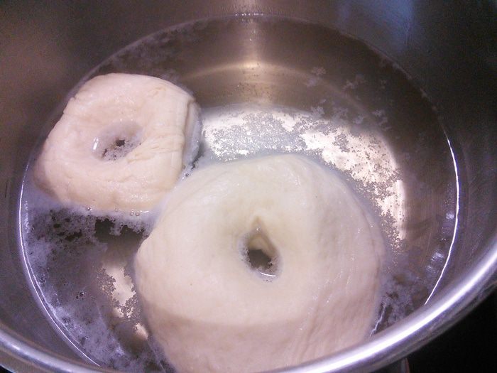 Для бубликов я использовала картофельный отвар. Для этого нужно отварить крупную (200-250 грамм) картошку, очищенную и порезанную крупным кубиком в 350 мл воды. Картошку используем в другом блюде, а 250 мл отвара отмерим и охладим до теплой температуры приблизительно в 40°. Это чуть теплее, чем температура тела. В этой воде растворим дрожжи и оставим на 10 минут для активации дрожжей.