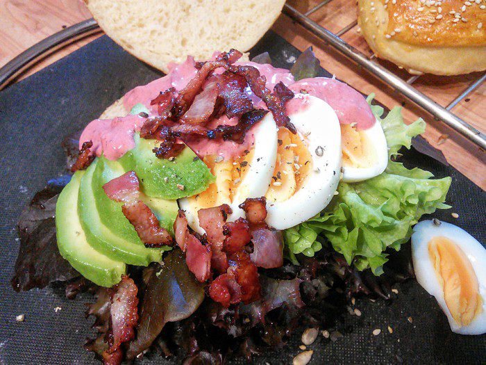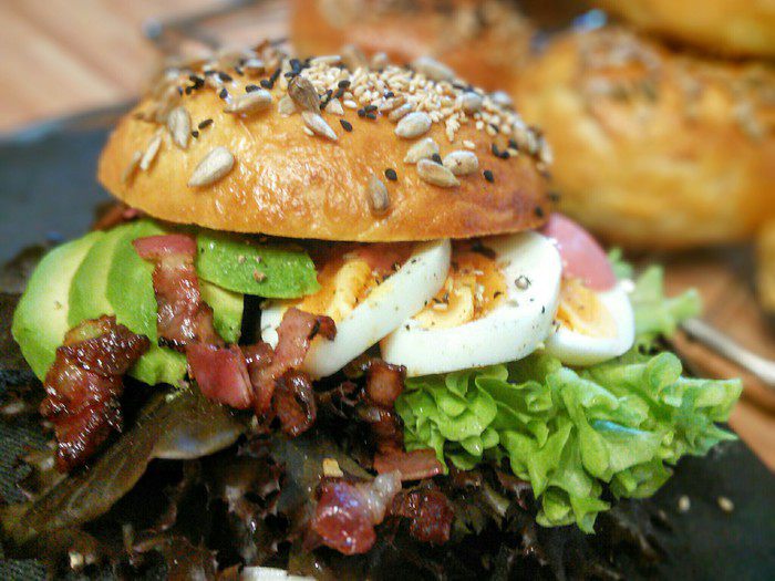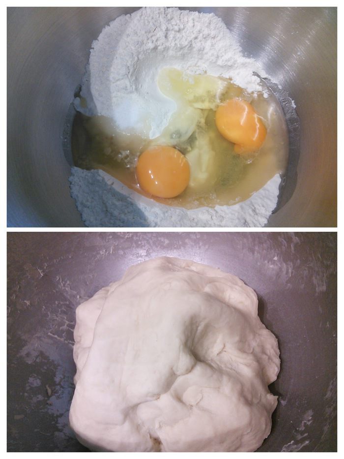 150 г просеянной муки соединить в чаше комбайна с солью, растительным маслом и яйцами и вымешивать на маленькой скорости первые 2 минуты. Влить дрожжевую воду. Постепенно добавить оставшуюся муку и вымешивать до тех пор, пока образуется среднее по плотности однородное тесто. Вымешиваем еще 5-7 минут, формируем шарик, накрываем пленкой и ставим в теплую духовку на 1 час для расстойки.