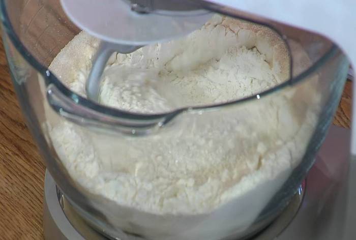 В чаше комбайна соединить муку, сахар, дрожжи и соль, все перемешать крюком для теста на низкой скорости.
