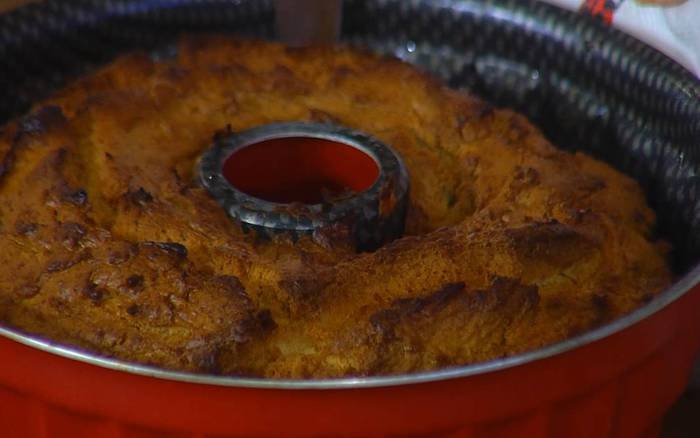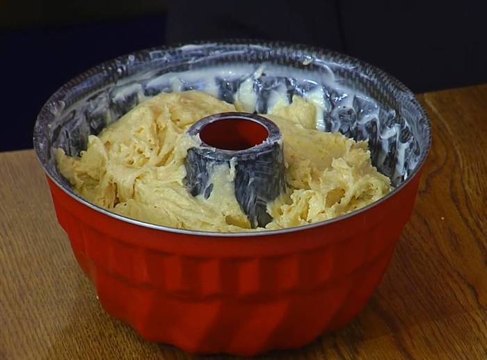 Готовую сдобу, перевернув форму, выложить на тарелку и посыпать сахарной пудрой.