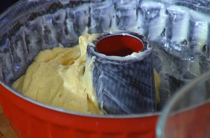 Накрыть форму с тестом полотенцем, смоченным в горячей воде и затем отжатым, и дать отдохнуть в теплом месте без сквозняков 10‒15 минут.
