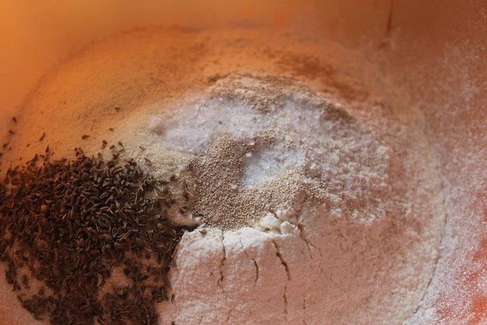 В чашку просеять муку, добавить манку, анис, дрожжи, соль. Вливаем воду и замешиваем тесто.