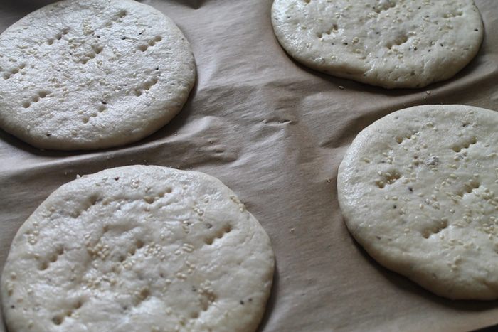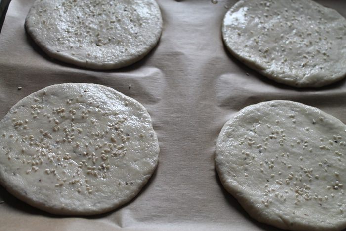 Через час тесто обмять и разделить на 4 части. Раскатать в лепешки (10 см в диаметре), смазать растительным маслом и посыпать кунжутом. Накрыть пленкой и оставить на 20 минут.