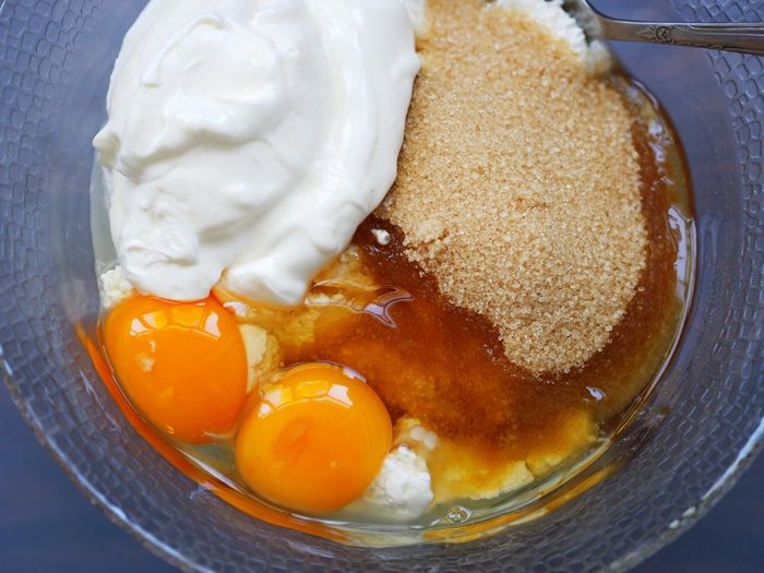 Хорошенько растереть в большой миске творог, сметану, сахар и яйца (можно даже слегка взбить блендером или венчиком). Сахара не жалейте, особенно, если вы используете кислую ягоду.