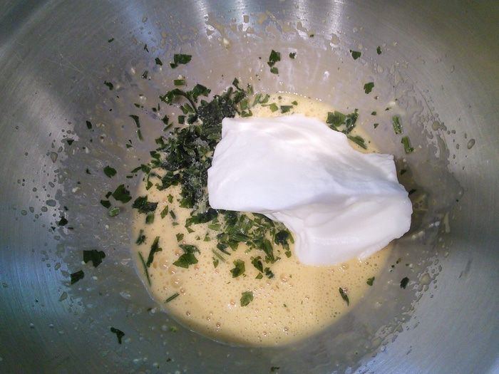 Добавить половину зелени и ввести частями взбитые белки, аккуратно размешать лопаточкой.