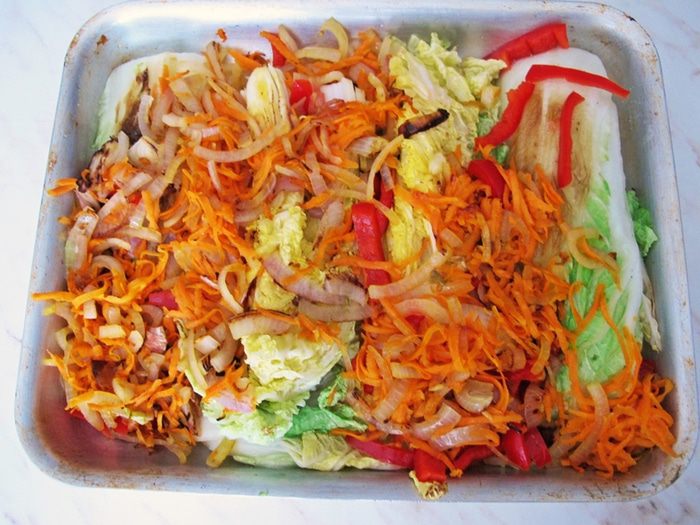 В форму выложить капустные четвертинки, сверху распределить пассерованные овощи и болгарский перец.