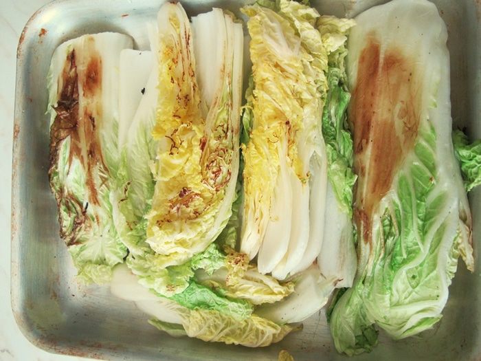 Капусту обжарить на сковороде на сильном огне до зарумянивания, по 2-3 минуты на каждую сторону.