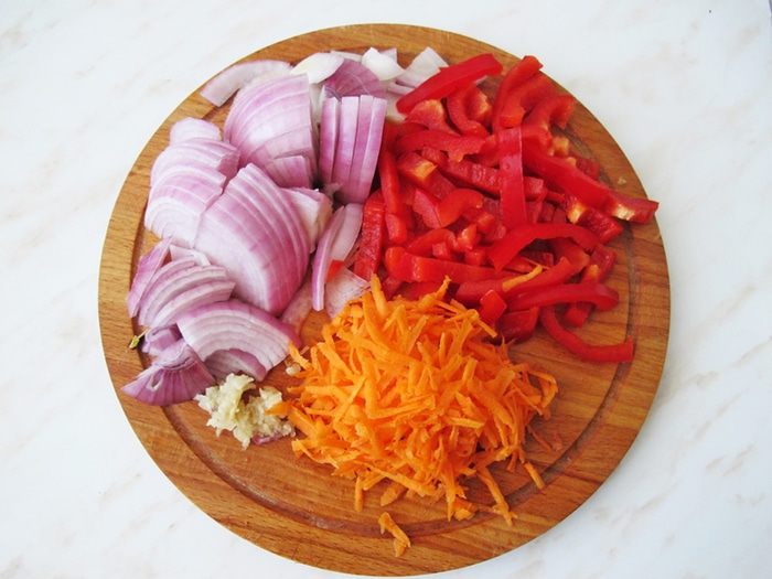 Почистить и порезать полукольцами лук. Морковь и сыр натереть на крупной терке, измельчить чеснок. Болгарский перец нарезать небольшими полосками.