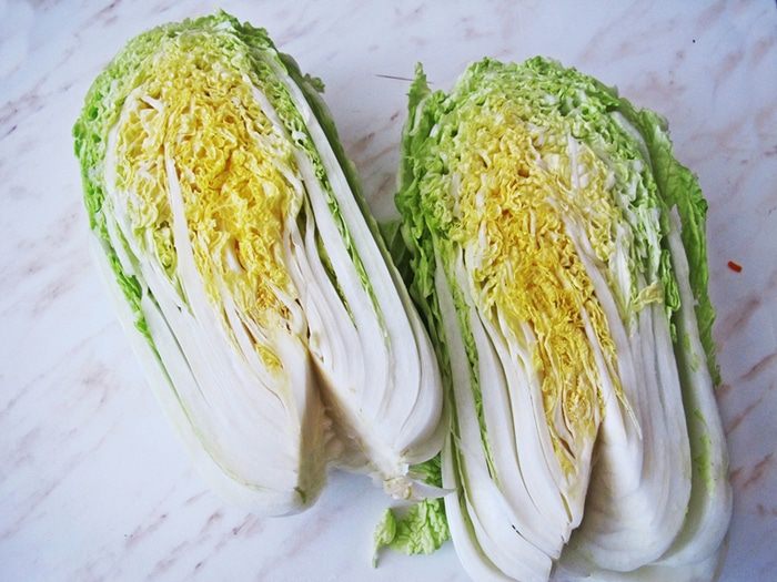 Пекинскую капусту разрезать на четвертинки вдоль, удалить "кочерыжки" и особенно твердые части листьев.