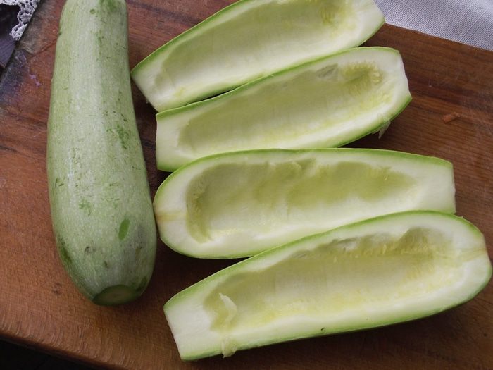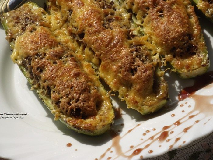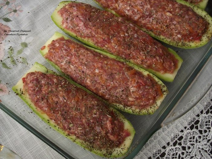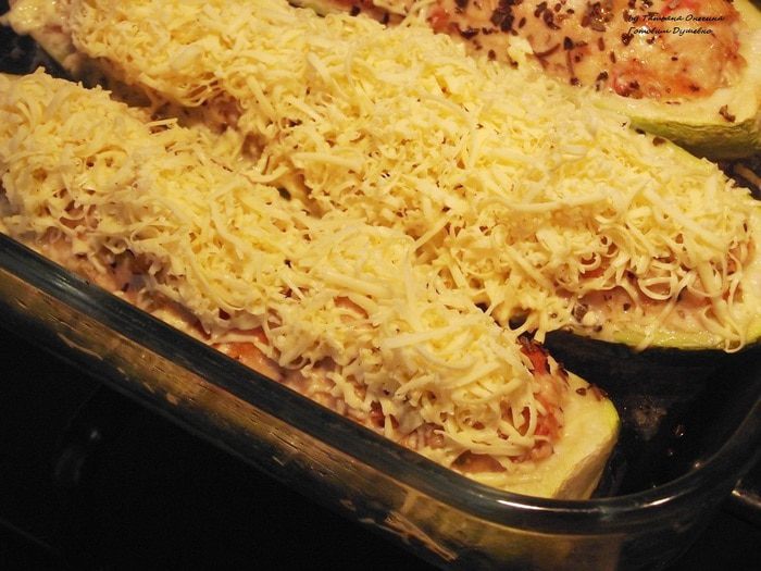 Мелко порезать лук, натереть на крупной терке морковь, мелко порезать помидор. На небольшом количестве масла припустить лук, затем добавить морковь, помидоры. Тушить 2-3 минуты. Посыпать прованскими травами. Фарш приправить солью и смесью перцев по вкусу, добавить щепотку мускатного ореха, немного коньяка. Хорошо перемешать фарш. Тушеные овощи добавить к фаршу и перемешать. Наполнить половинки кабачков так, чтобы фарш полностью покрывал всю половинку. Выложить кабачки в форму, смазанную маслом.