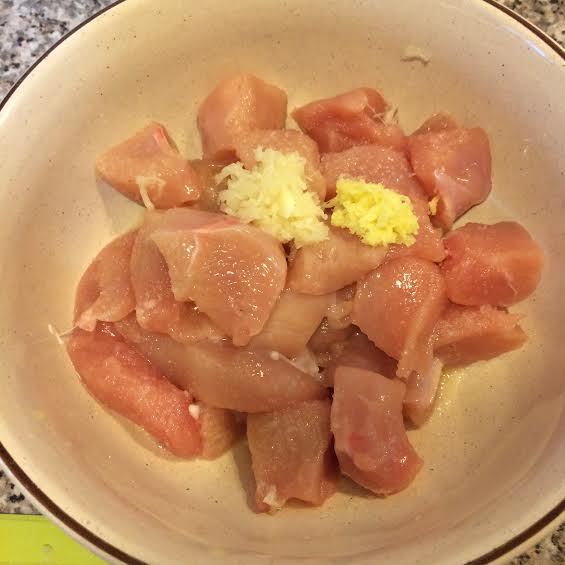 Для первого маринада: куриные грудки порезать, добавить 1 ч.л соли, 1ч.л натертого имбиря, 1 ч.л натертого чеснока и 2 ст.л лимонного сока. Хорошо перемешать и оставить на 20 минут при комнатной температуре.