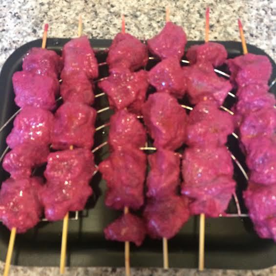 Если жарить на деревянных шпажках, то их нужно заранее замочить в воде на 30 минут. Шашлык можно жарить на гриле по 4 минуты каждую сторону, но я жарила в духовке при температуре 200°C до румяной корочки, периодически переворачивая.