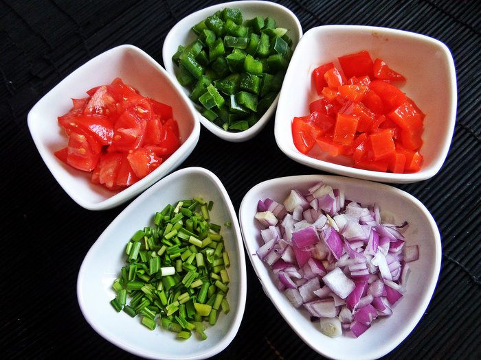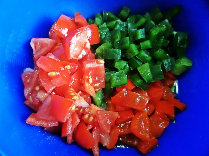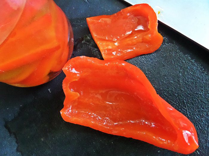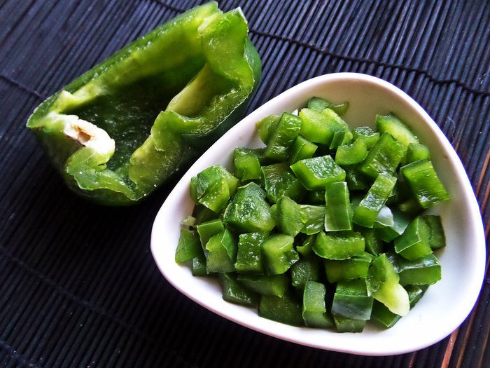 Красный перец был дома маринованный, вынимаем ломтики из рассола, даем стечь и делим на кусочки помельче. Рецепт маринования очень простой вот тут: http://www.edimdoma.ru/retsepty/59946-marinovannyy-perets