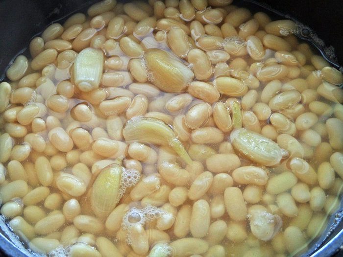 Отварить заранее фасоль с добавлением 3-4 зубчиков чеснока.