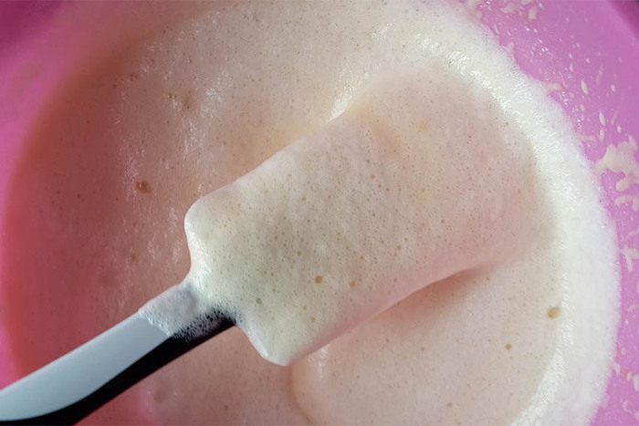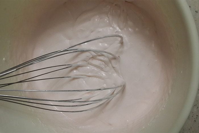 Взбить крем. Для это взбить сметану с пудрой на средней скорости минут 5. Добавить столовую ложку лимонной цедры и сок лимона. Крем загустеет от сока. Добавить краситель. Взбить немного до однородности.