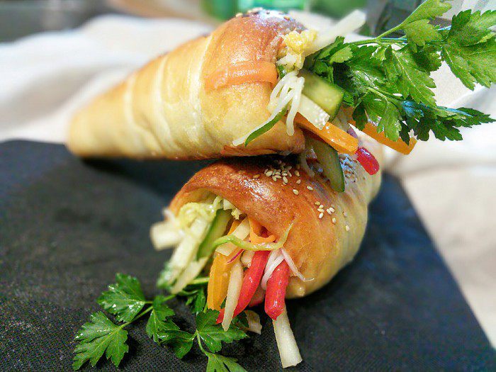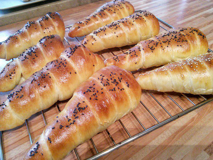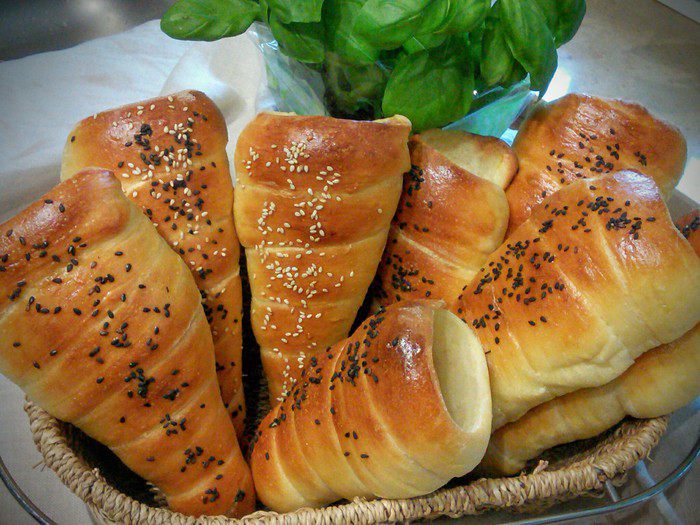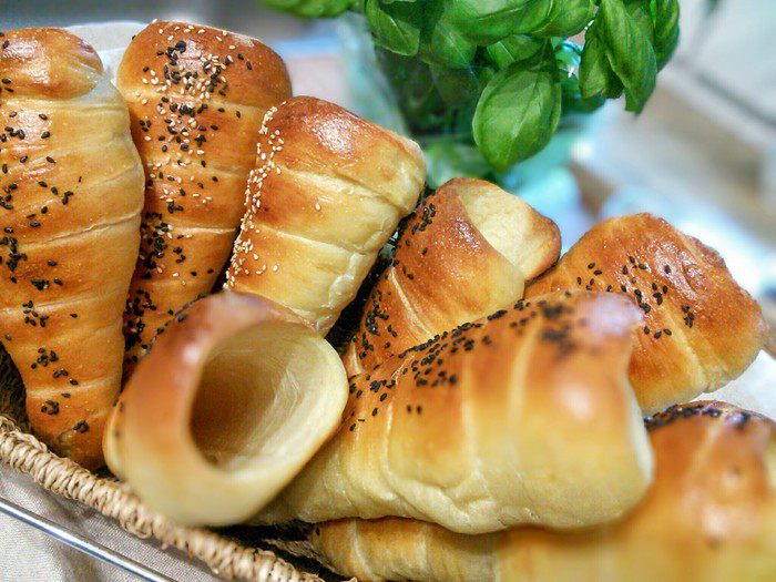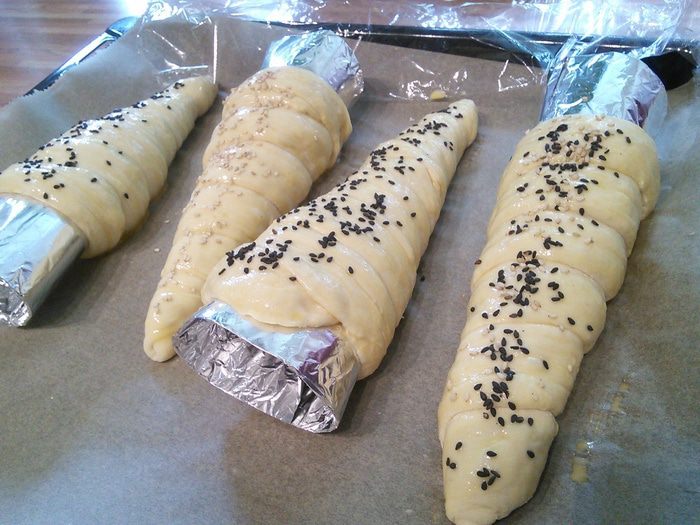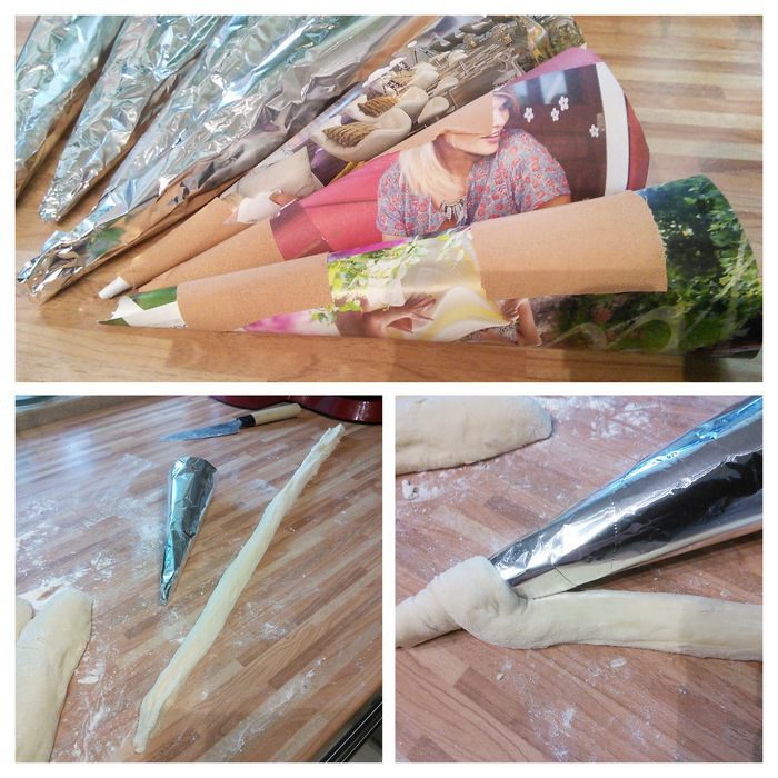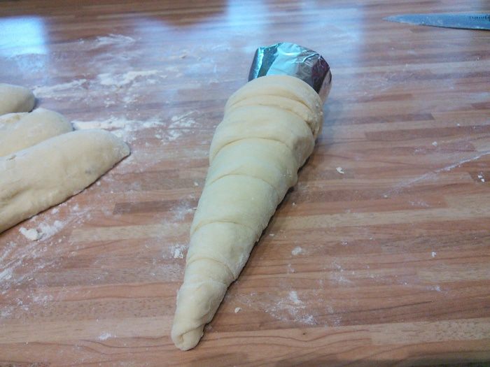 Из каждой части сформировать длинную полоску. Теперь было бы здорово иметь специальные конусные формы, которые нужно смазать маслом и обкрутить их тестом. Но у меня таких форм еще нет, поэтому я смастерила их из плотной бумаги, которые обмотала фольгой.