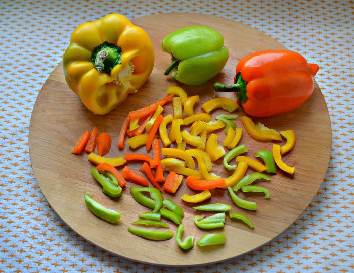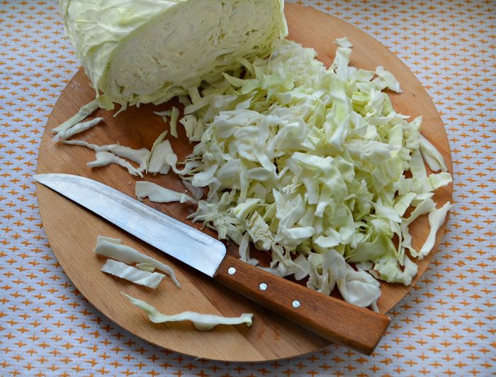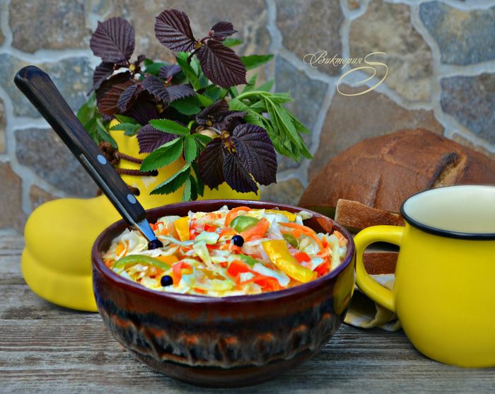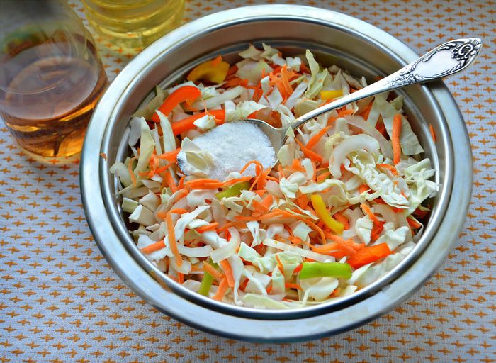 Перемешайте капусту, лук, перец, морковь в большой миске. Добавьте, соль, сахар, уксус, растительное масло и тщательно перемешайте. Лучше это сделать руками. Переложите капусту по банкам, накройте крышкой и оставьте при комнатной температуре на 2-3 дня. Затем уберите в холодильник.