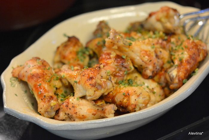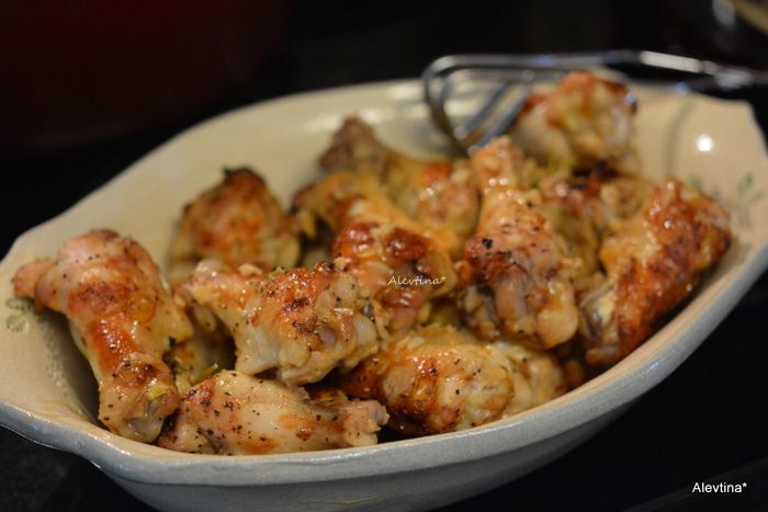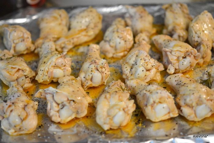 Окунаем каждое крылышко в соус. Выкладываем на противень. Посолить и поперчить. Ставим в разогретую духовку или гриль 230°С. Один раз перевернув. Готовим примерно 20 минут или 10 минут сторона.
