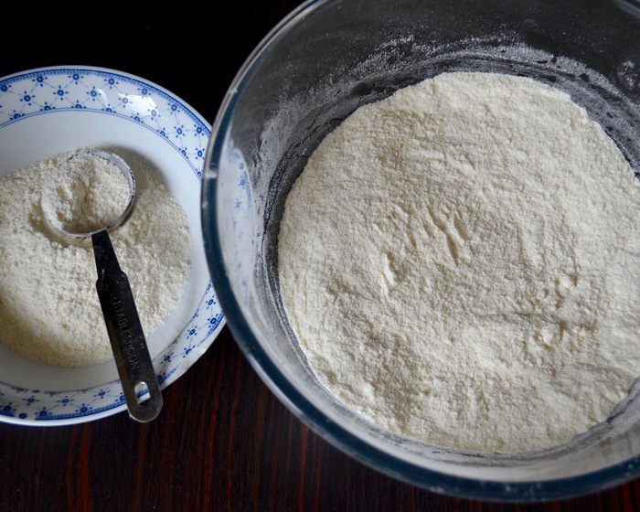В миске смешать просеянную муку, сахар и разрыхлитель. Как следует перемешать и отложить 3 ст.л. сухой смеси.