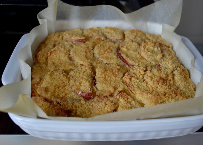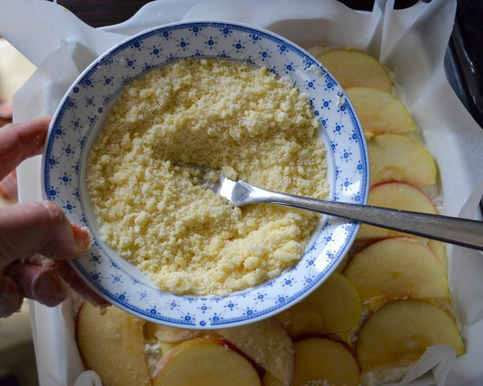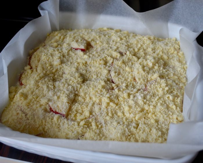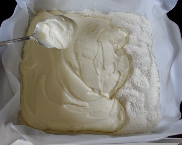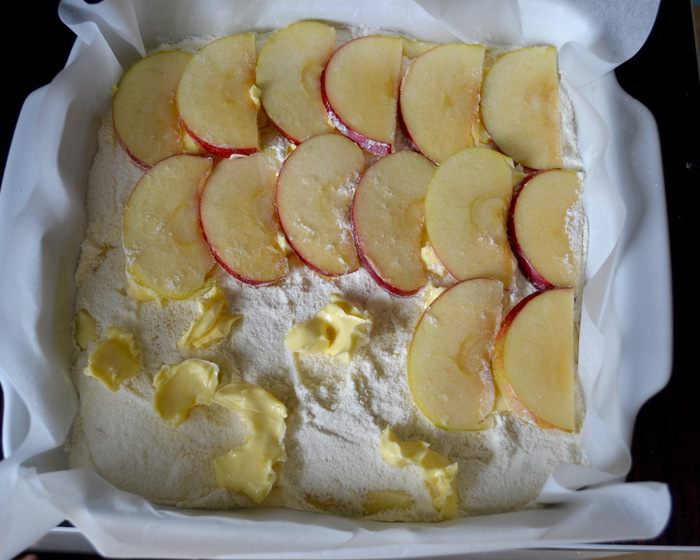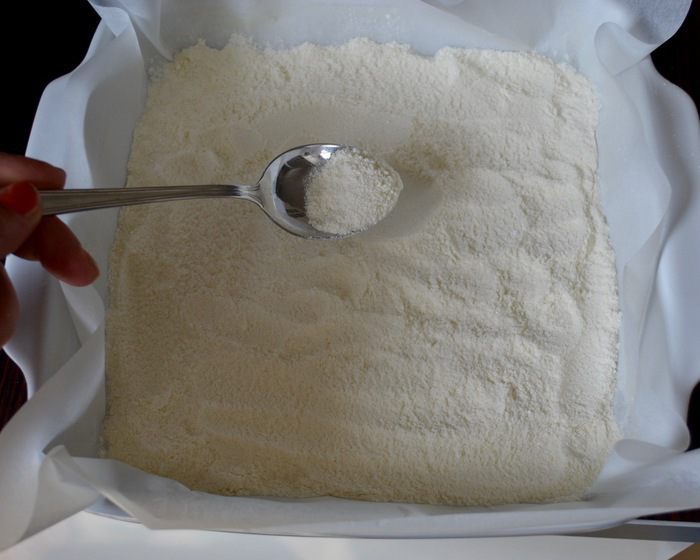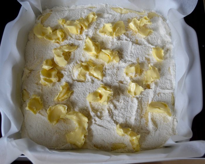 Форму размером 25х25 см проложить пекарской бумагой (или смазать немного маслом). Половину мучной смеси насыпать на дно формы, распределяя ровным слоем.