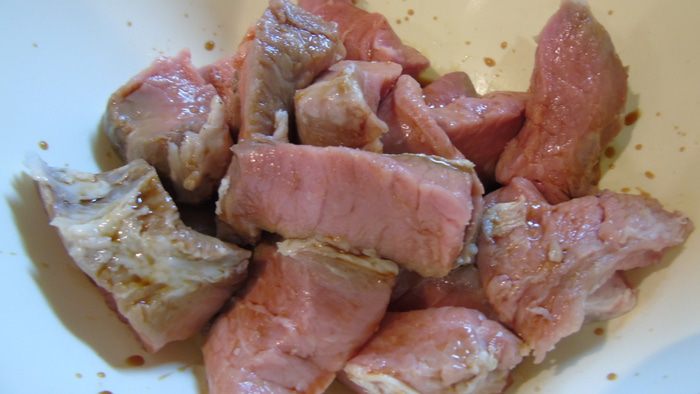 Мясо нарезаем на кусочки примерно одинаковой величины, и заливаем соусом терияки.
