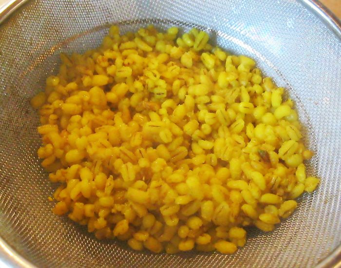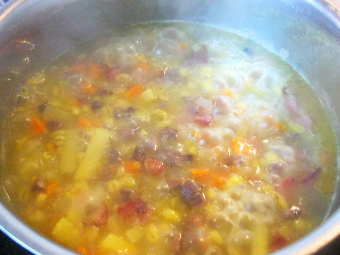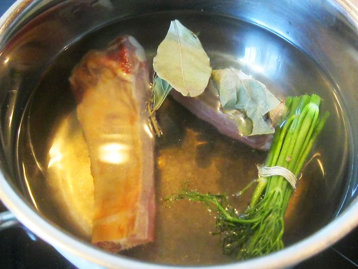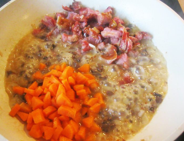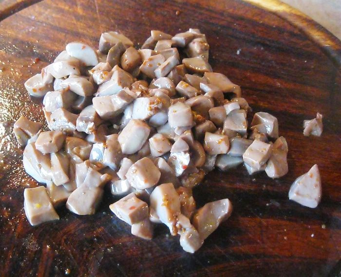 В небольшом количестве растительного масла спассеровал лук. Когда он стал полупрозрачным добавил почки. Почки дали много сока, оставил их потушиться три минуты. За это время срезал с ребрышка мясо и нарезал его кусочками. Когда почки слегка потемнели, а лишняя влага выпарилась, добавил в сковородку свинину, морковь, а вместо соли половник огуречного рассола. Хорошенько перемешал и оставил тушиться под крышкой на среднем огне.