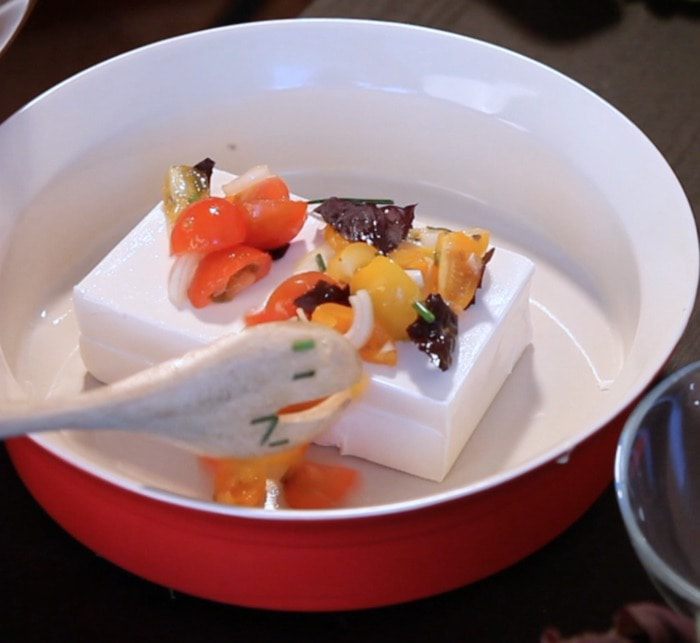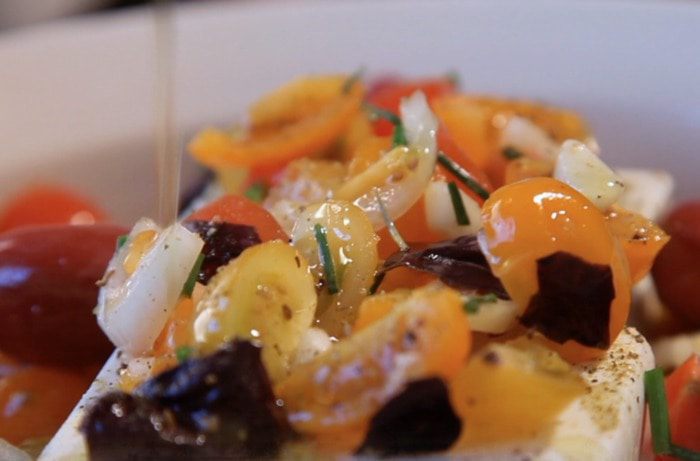 В форму для запекания положить сыр, сверху выложить овощи, вяленые томаты, оливки.