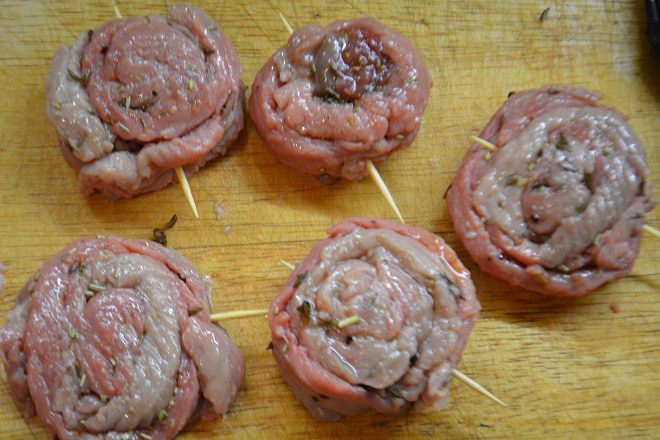 Свернуть каждый ломтик в виде улитки, закрепить шпажкой и смазать сверху оливковым маслом. Дать минут 20 полежать-промариноваться.