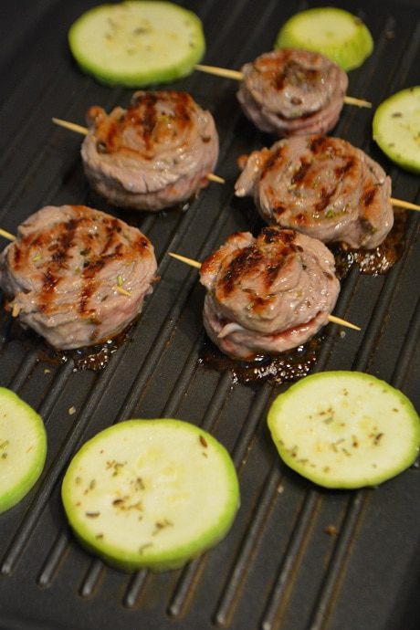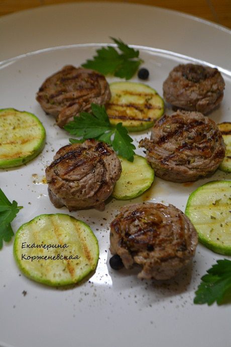 Обжарить на гриле в течение 10-15 минут до хрустящей корочки. Одновременно с мясом обжарить колечки молодых кабачков.