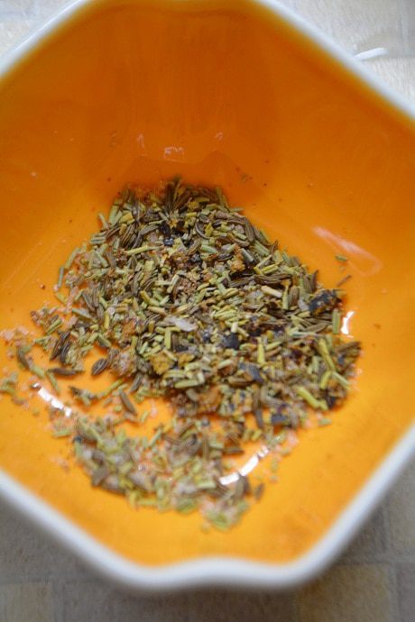 Смешать розмарин, тмин, соль, перец чили и ягоды можжевельника. Истолочь.