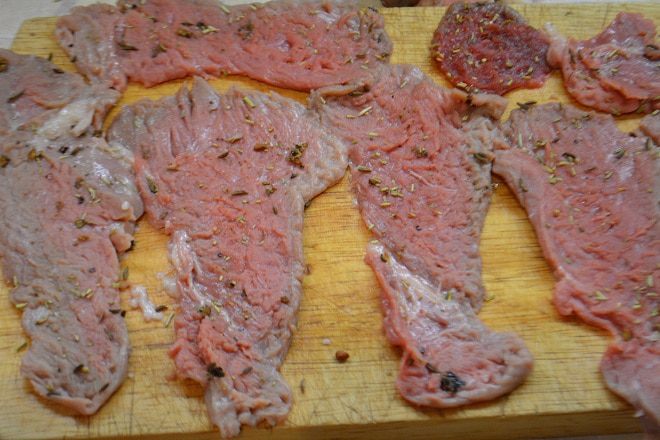 Мясо помыть и обсушить бумажным полотенцем. Нарезать на тонкие ломтики и хорошо отбить.