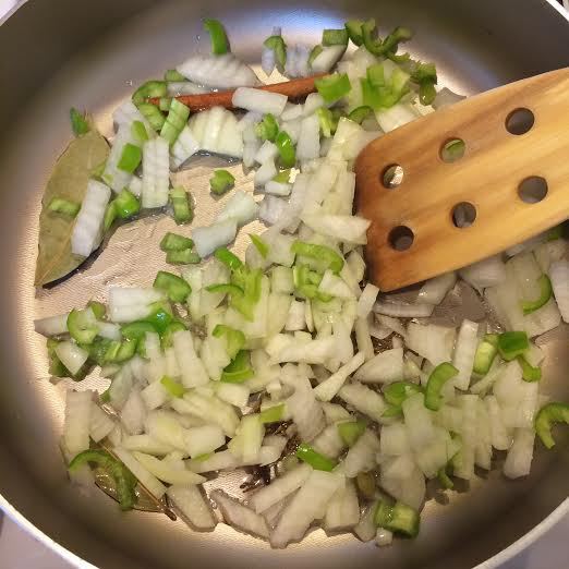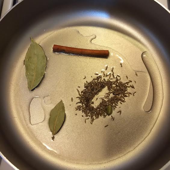 В глубокую сковороду налить немного растительного масла, добавить палочку корицы, лавровый лист, кардамон, тмин и гвоздику.