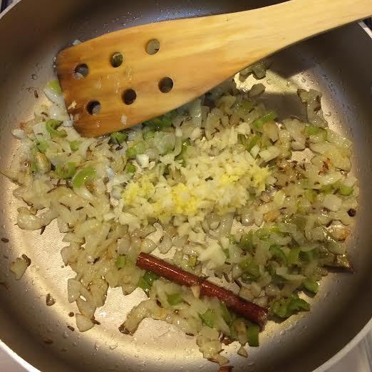 Когда лук станет золотистого цвета, добавить чеснок и имбирь.