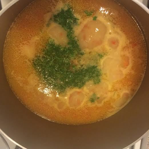 Начать постепенно добавлять нутовое пюре, хорошо мешая ложкой, чтобы пюре растворилось. Добавить зелень, чеснок,соль, перец и снять с огня.