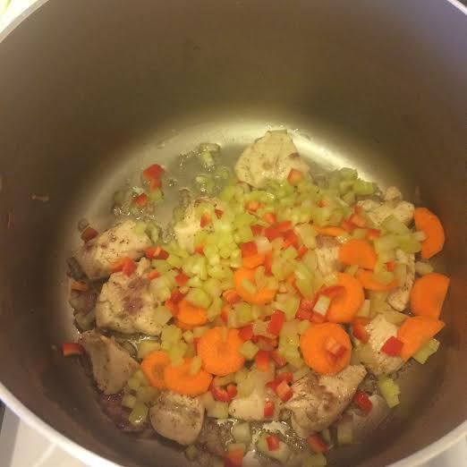 Лук потушить до золотистого цвета, добавить куриную грудку, посолить, поперчить и тушить пару минут. Добавить овощи, тушить 3 — 4 минуты.