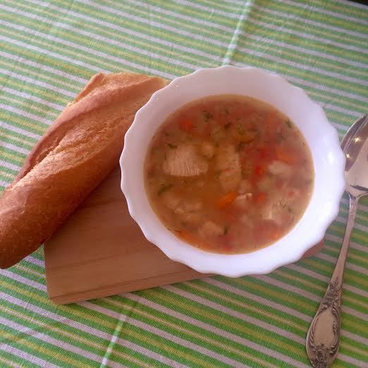 Залить нутовым бульоном и варить 5 минут. Помидор очистить и натереть на крупной терке, добавить в суп. Варить 5 минут.