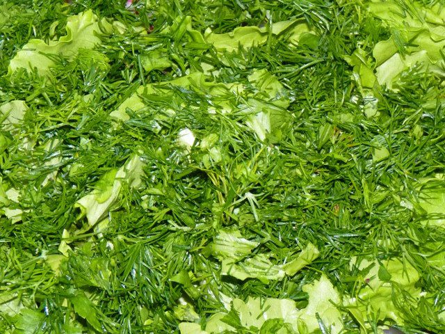 Перемешать зелень, выложить в форму, залить яичной смесью. Натереть сыр и густо посыпать омлет. Выпекать в заранее разогретой до 160°C духовке 20 минут.