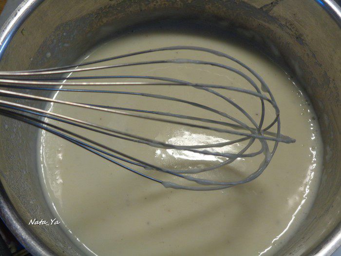 Добавить муку. Хорошо прогреть 4 — 5 минут. Если зарумянить муку слишком быстро, в соусе останется ее привкус, т.е. соус готовим на маленьком огне.