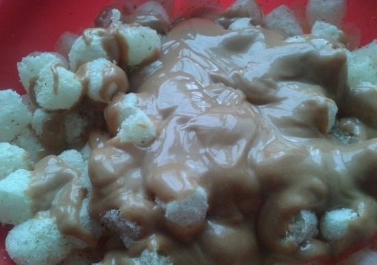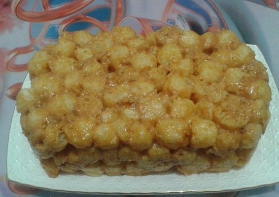 Смешать кукурузные палочки, орехи и сгущеное молоко.
