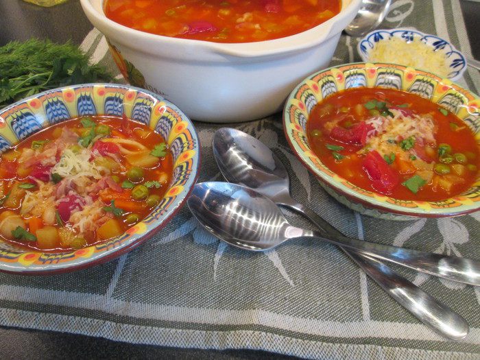Обед в итальянском стиле продолжается. Теперь очередь супа, и я предлагаю попробовать густой суп минестроне — такую же классику итальянской кухни, как спагетти, лазанья и пицца.