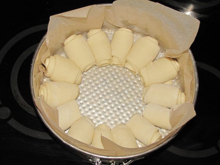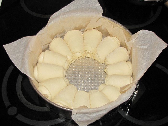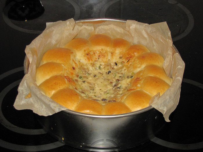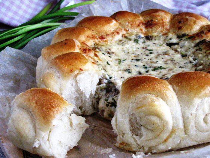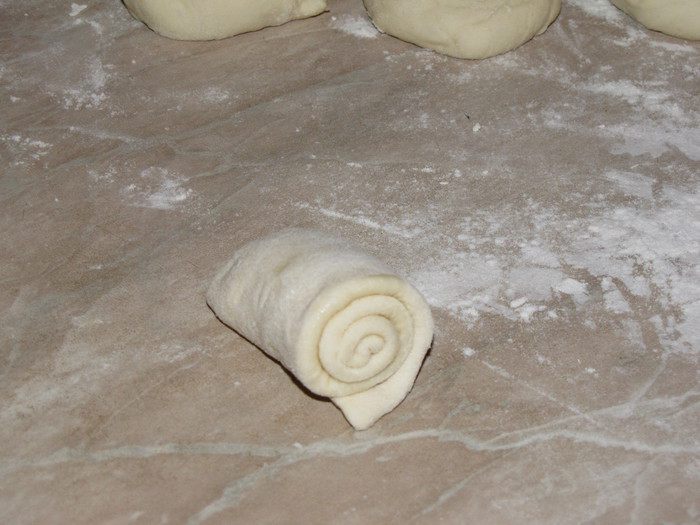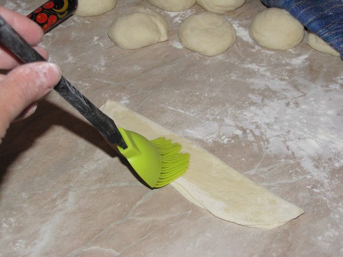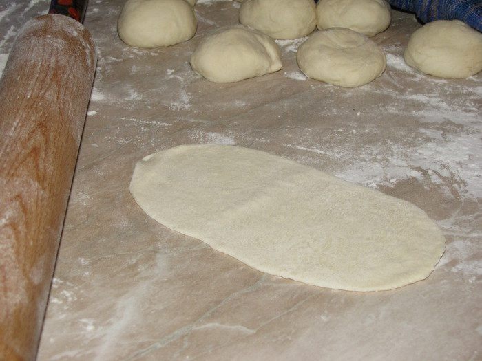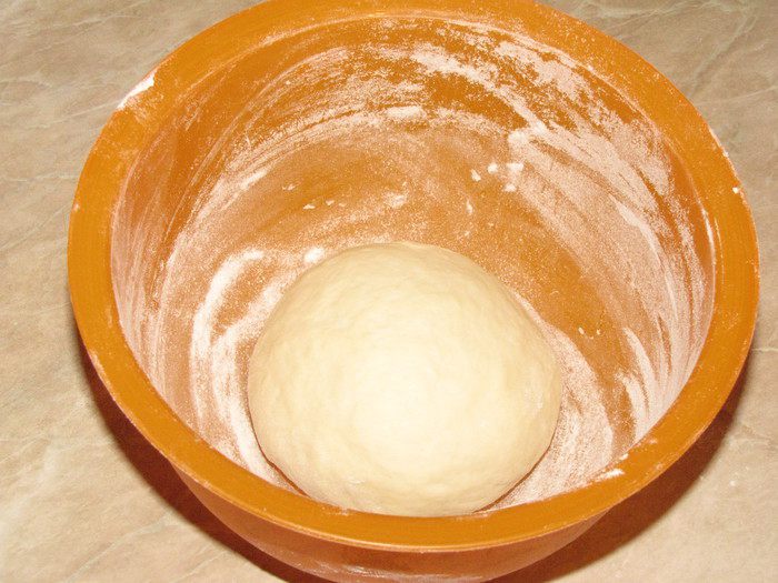 Замесить мягкое эластичное тесто. Вымешивать примерно минут 10, пока тесто не перестанет липнуть к рукам. Собрать тесто в шар, переложить в миску, обсыпанную мукой, накрыть крышкой или полотенцем и поставить в теплое место для подъема, примерно на 1—2 часа, в зависимости от того, как сработают дрожжи.