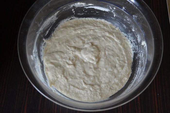 Следом добавить теплую воду с дрожжами и перемешать до однородной липкой массы. Накрыть миску чистым полотенцем и оставить в теплом месте примерно на час.