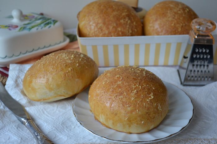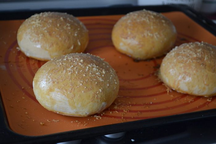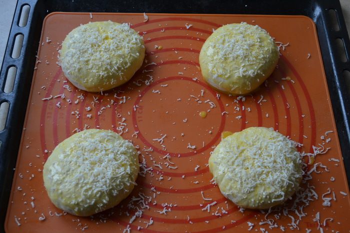 Смазать булочки яйцом и обильно посыпать натертым на мелкой терке пармезаном.