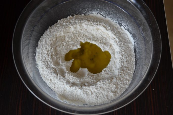 Просеять в миску 200 г муки, добавить соль. Сделать в муке углубление и добавить оливковое масло.