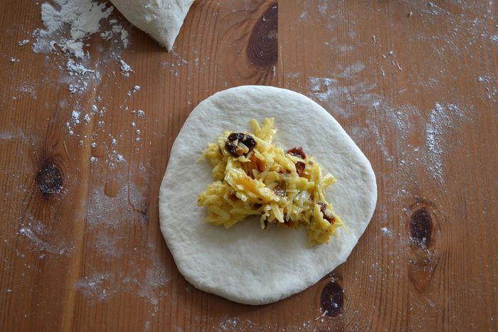 В центр лепешки положить примерно столовую ложку начинки.